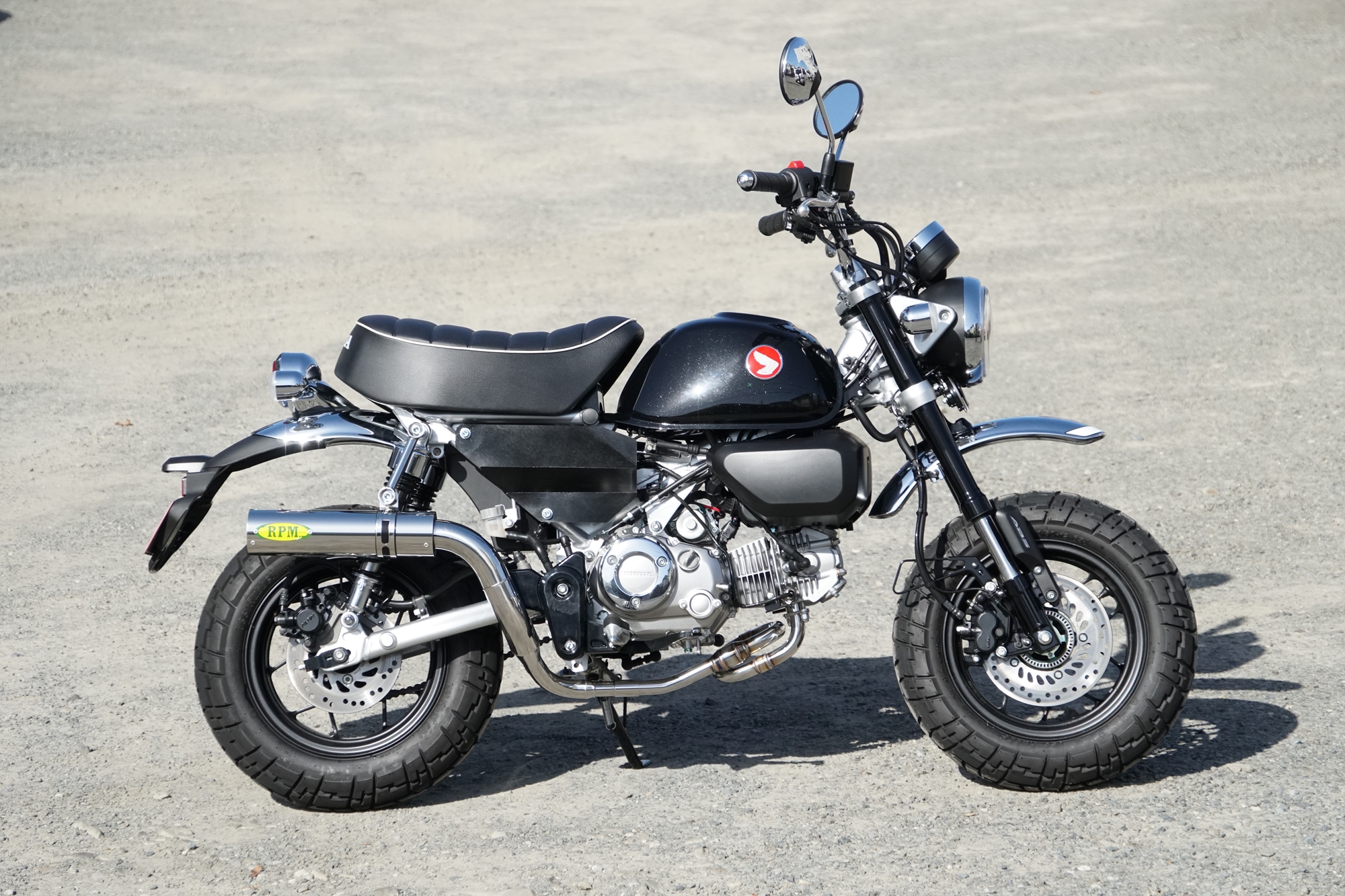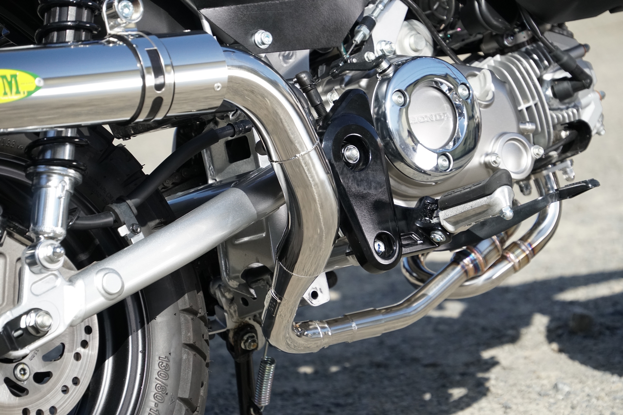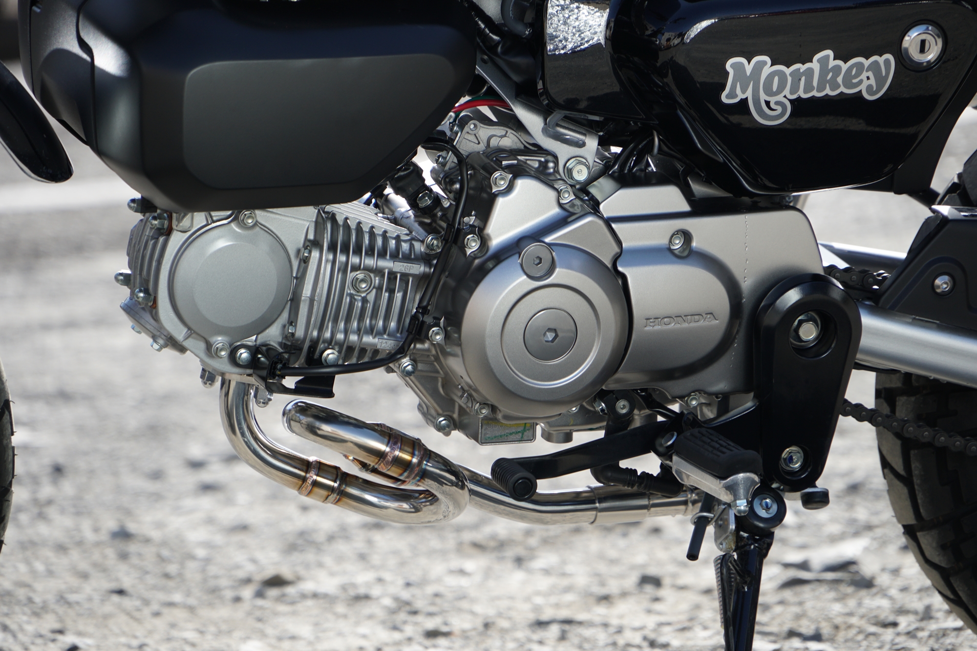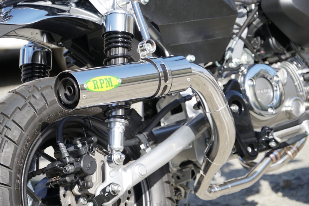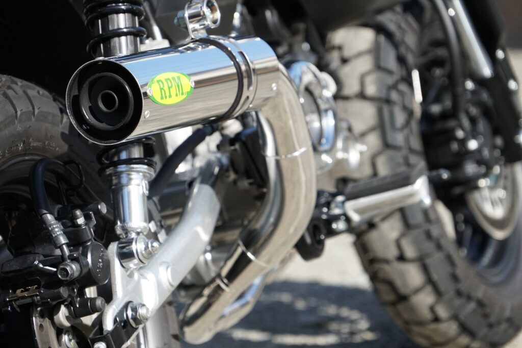 今回の開発で、もうひとつ大きなテーマとなったのが装着時の全体シルエットです。Monkey125は車体がコンパクトであるがゆえに、マフラーの存在感が強すぎるとバランスを崩しやすく、逆に控えめすぎるとカスタムパーツとしての魅力が薄れてしまいます。RPMでは、エキゾーストパイプ長という性能面での必須条件を満たしながら、