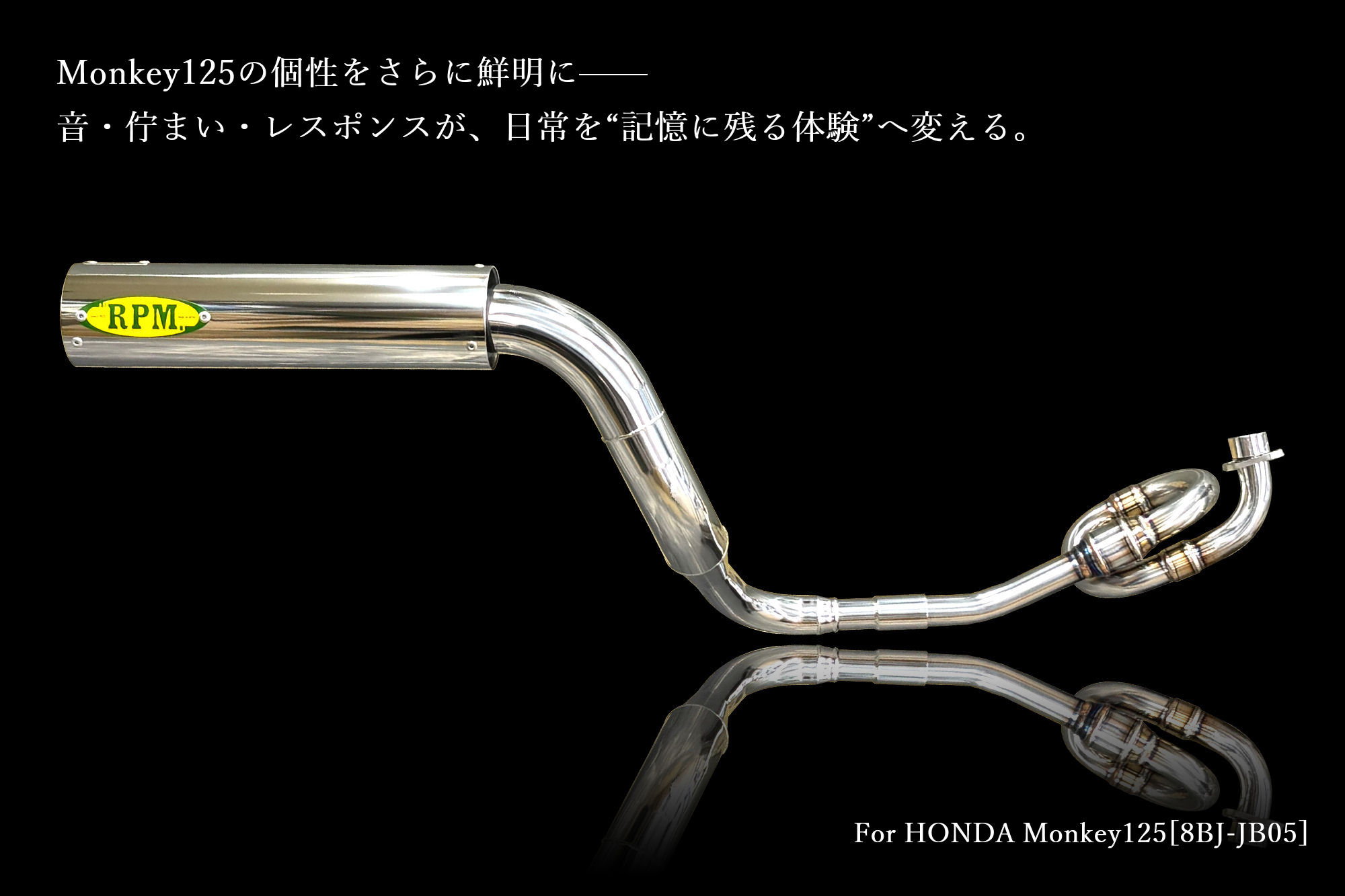 外装には、高品位な仕上げを施したSUS304ステンレスを採用。光の当たり方によって表情を変える鏡面の質感は、Monkey125のコンパクトな車体に程よい存在感を与え、カスタムマシンとしての完成度を一段引き上げます。もちろん、音量や環境性能にも十分配慮しています。各種法規に対応した設計とすることで、公道使用においても安心してお使いいただける仕様としています。