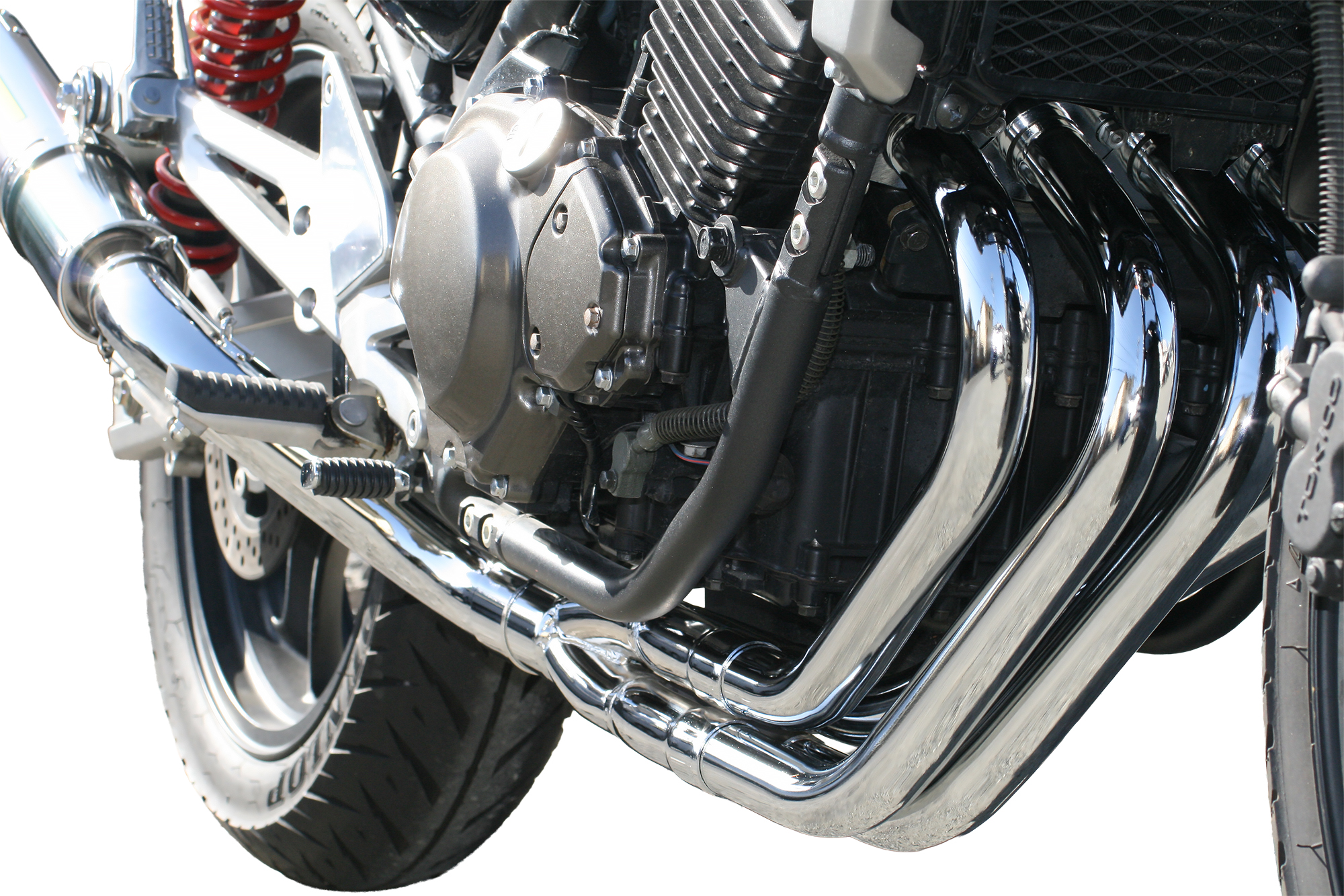 「(エンジンから集合部までの)フロントエキゾーストパイプ 4本」と「集合部」「テールパイプ」「サイレンサー」の計7つのパーツから成るフルエキゾーストマフラーです。